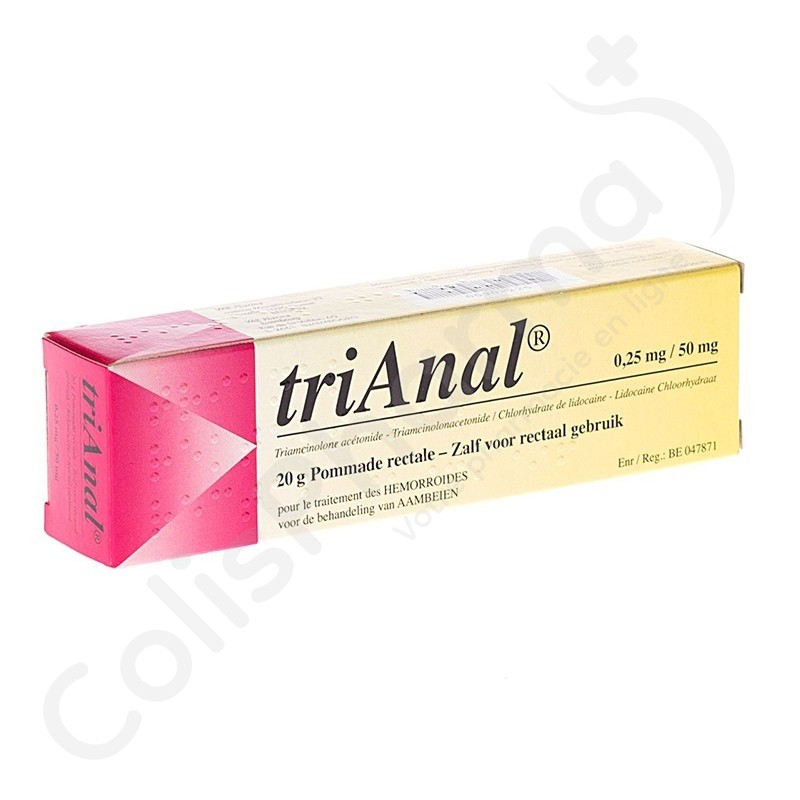 TriAnal verlicht de ontsteking en pijn van aambeien. Deze rectale zalf kan ook worden gebruikt bij eczeem en jeuk in de anale zone. Om het ontstaan van aambeien te voorkomen, wordt een vezelrijk dieet aanbevolen om constipatie te voorkomen.
