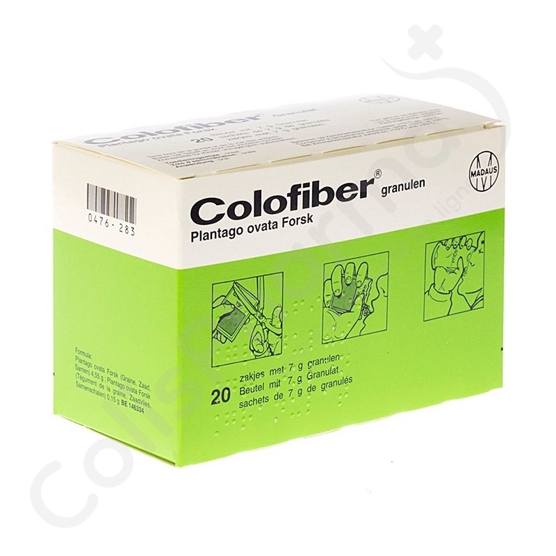 Colofiber wordt geleverd in een doos met 20 zakjes van 7 g granulaat, oraal in te nemen. Colofiber bevat een plantaardige vulstof die de darmfunctie helpt reguleren. Colofiber reguleert de darmfunctie in de volgende gevallen: