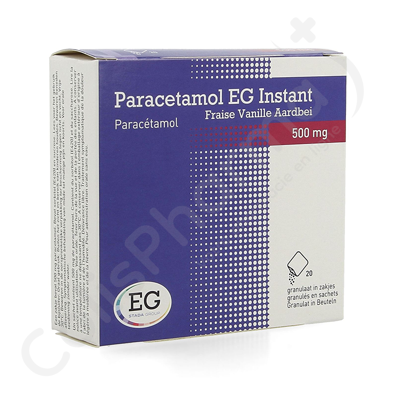 Paracetamol EG Instant Vanille-Aardbei 500 mg, verkocht in België, is een pijnstiller en koortsverlagend middel met paracetamol als werkzame stof. Het is daarom gelijkwaardig aan Doliprane, verkocht in Frankrijk, waarvan ook paracetamol als werkzame stof aanwezig is. Doliprane, de Franse merknaam voor paracetamol, is te vinden op ColisPharma onder de volgende naam: Paracetamol.