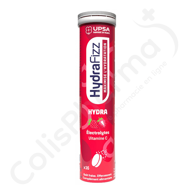 Wilt u uw dagelijkse hydratatie op een eenvoudige manier optimaliseren? Ontdek de Hydra-hydratatietabletten met een heerlijke aardbeiensmaak, ontwikkeld in Frankrijk door de UPSA-laboratoria. Ze combineren 4 essentiële elektrolyten die een optimale opname van water door het lichaam bevorderen. Verrijkt met vitamine C helpen deze bruistabletten de oxidatieve stress van uw lichaam te verminderen en ondersteunen zij de normale werking van het immuunsysteem.