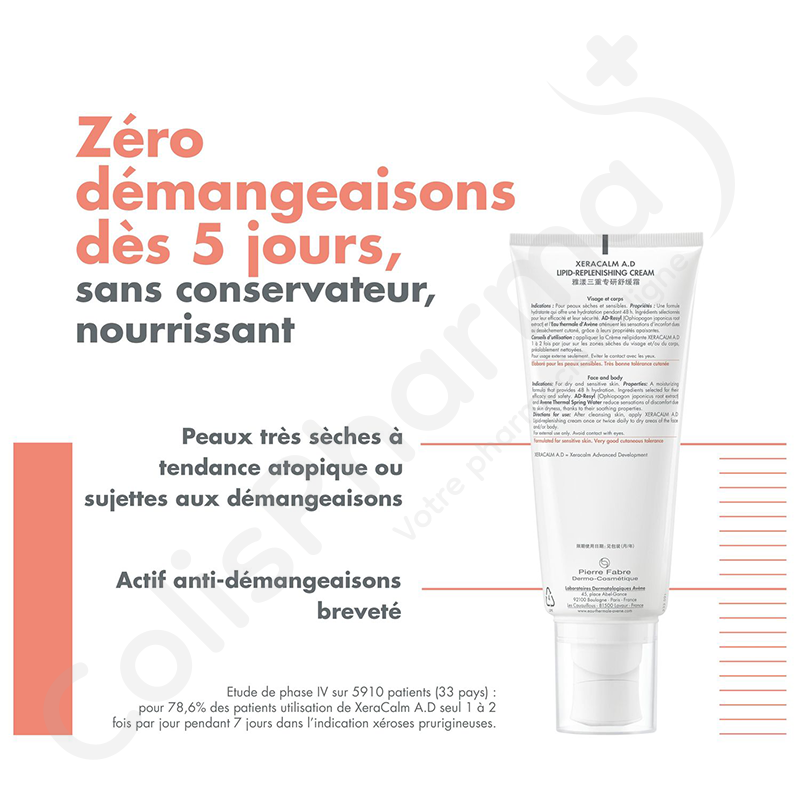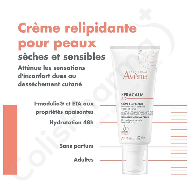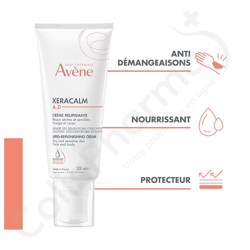 XERACALM A.D Lipidenherstellende Crème verzacht de jeuk veroorzaakt door een droge huid en respecteert het huidmicrobioom, dankzij de combinatie van I-modulia®, het eerste postbiotische actieve bestanddeel afkomstig uit het Thermaalwater van Avène. Dit bestanddeel vermindert jeuk*, stimuleert de natuurlijke afweer van de huid en helpt huidirritaties te verminderen. De Cer-omega, huidverwante lipiden, werken in op droogheid en helpen de huidbarrière te herstellen. Het thermaalwater van Avène heeft bovendien een verzachtende, kalmerende en huidvriendelijke werking.