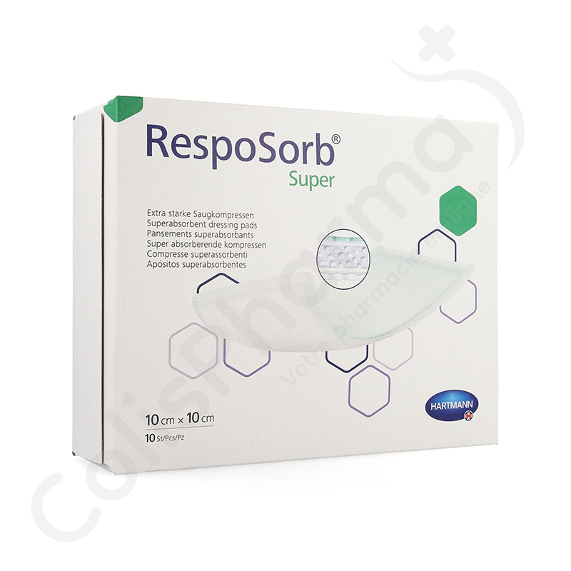RespoSorb Super absorbeert wondexsudaat en secreties snel, zelfs onder compressie, en houdt deze vast in de absorberende centrale kern; voorkomt maceratie en zorgt voor een vochtig wondmilieu. RespoSorb Super heeft niet alleen een sterk absorberende werking, maar dempt de wond ook goed. Het verband hoeft minder vaak verwisseld te worden omdat RespoSorb Super meer vocht kan opnemen, waardoor de wond beter tot rust komt en extra bescherming biedt tegen contaminatie. RespoSorb Super is een absorberend verband dat bestaat uit vier lagen van verschillende materialen; het is volledig gesloten en heeft afgeronde hoeken.