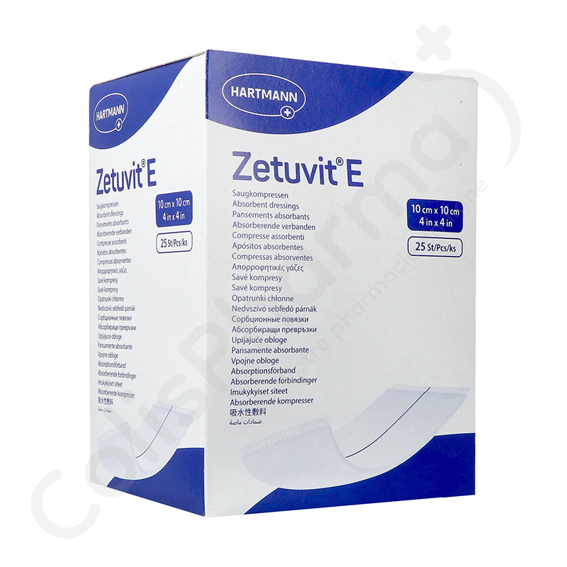 Zetuvit E is opgebouwd uit vier lagen. De absorberende kern van cellulosewatten is gewikkeld in een dunne laag non-woven cellulose om ervoor te zorgen dat vloeistoffen gelijkmatig over het verband worden verdeeld. De blauw gemarkeerde achterkant van het kompres is gemaakt van niet-geweven polypropyleen, dat hydrofoob maar niet-occlusief en ademend is. Dit voorkomt de vorming van exsudaatklonters in het verband. De voorkant is gemaakt van een hydrofiel non-woven polypropyleen dat voorkomt dat het verband aan de wond kleeft. CE-gemarkeerd in overeenstemming met EU-richtlijn 93/42/EC.