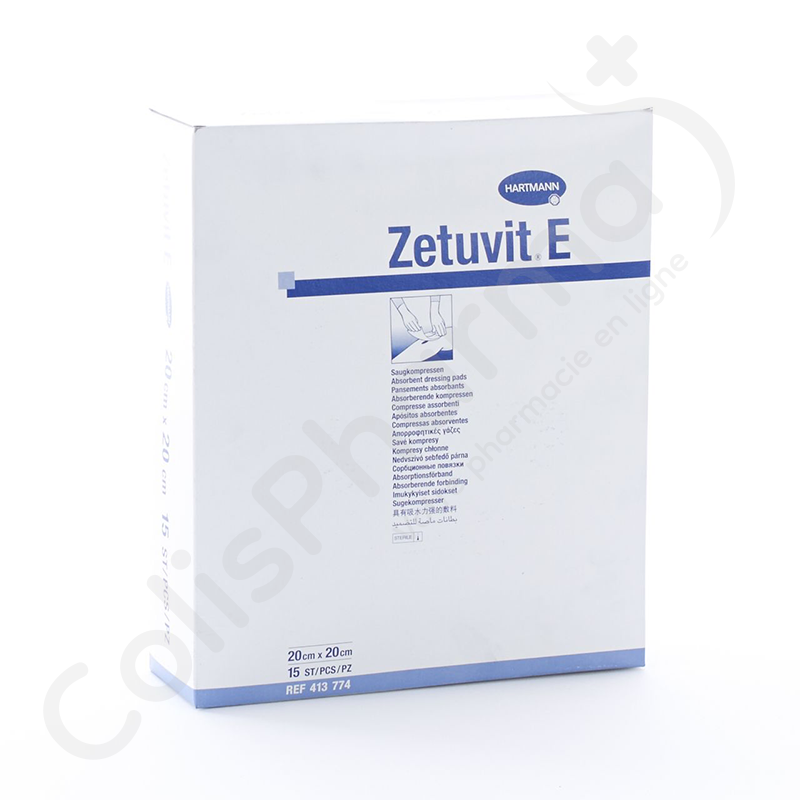 Zetuvit E is opgebouwd uit vier lagen. De absorberende kern van cellulosewatten is gewikkeld in een dunne laag non-woven cellulose om ervoor te zorgen dat vloeistoffen gelijkmatig over het verband worden verdeeld. De blauw gemarkeerde achterkant van het kompres is gemaakt van niet-geweven polypropyleen, dat hydrofoob maar niet-occlusief en ademend is. Dit voorkomt de vorming van exsudaatklonters in het verband. De voorkant is gemaakt van een hydrofiel non-woven polypropyleen dat voorkomt dat het verband aan de wond kleeft. CE-gemarkeerd in overeenstemming met EU-richtlijn 93/42/EC.