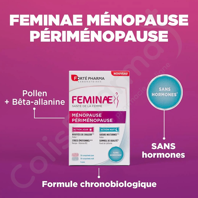 FEMINÆ Menopause Perimenopause bevat geen synthetische hormonen of fyto-oestrogenen* en is speciaal ontwikkeld om de ongemakken van de menopauze te verlichten, zowel overdag als 's nachts, en om uw menopauze rustiger te beleven.
