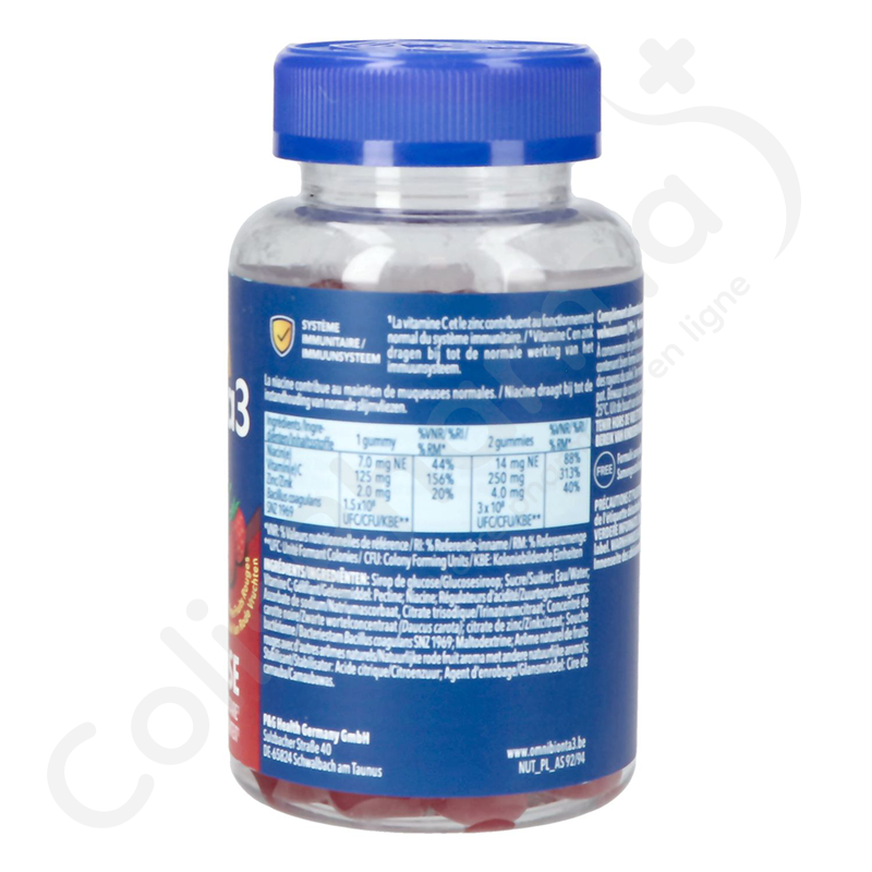 Glucosestroop; Suiker; Water; Vitamine C; Geleermiddel: Pectine; Niacine; Zuurteregelaars: Natriumascorbaat, Trinatriumcitraat; Zwarte wortelconcentraat (Daucus carota); Zinkcitraat; Bacteriestam Bacillus coagulans SNZ 1969; Maltodextrine; Natuurlijk rood fruitaroma met andere natuurlijke aroma's; Stabilisator: Citroenzuur; Glansmiddel: Carnaubawas.