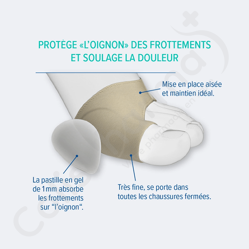 De hallux valgus bescherming van Epitact voorkomt en verlicht de pijn die wordt veroorzaakt door overmatige druk en wrijving op de “bunion” tijdens het lopen. Het is vooral aangewezen bij een gevorderde hallux valgus, wanneer de grote teen niet meer lateraal beweeglijk is.
