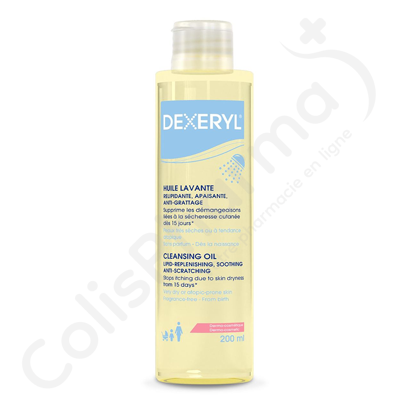 Een droge of atopische huid kan geïrriteerd raken door zeep en water. DEXERYL reinigingsolie is speciaal ontwikkeld om de droge, zeer droge of atopiegevoelige huid op milde wijze te reinigen, te kalmeren en aan te vullen zonder de huidbarrière aan te tasten. De jeuk die gepaard gaat met een droge huid verdwijnt voor 100% in 15 dagen en de huid van het hele gezin wordt gehydrateerd en aangevuld. De geur- en zeepvrije formule kan vanaf de geboorte gebruikt worden. De vloeibare textuur is aangenaam om aan te brengen en geeft een licht, zacht schuim op de huid dat gemakkelijk af te spoelen is.
