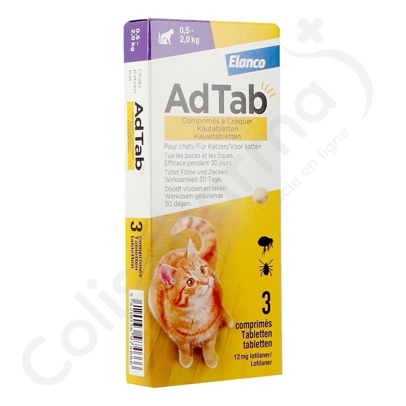 AdTab Kat is een kleine kauwtablet met vanillesmaak voor katten die teken en vlooien snel elimineert. AdTab doodt vlooien op katten voordat ze hun eitjes leggen. Hierdoor doorbreekt het medicijn de levenscyclus van vlooien en voorkomt het besmetting van de omgeving door vlooien op plekken die toegankelijk zijn voor de kat.