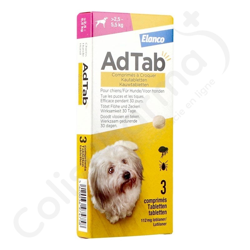 AdTab Hond is een kleine kauwtablet (vleessmaak) die teken en vlooien bij honden snel elimineert. AdTab doodt vlooien op honden voordat ze hun eitjes leggen. Hierdoor doorbreekt het medicijn de vlooienlevenscyclus en voorkomt het besmetting van de omgeving door vlooien op plekken die toegankelijk zijn voor de hond.