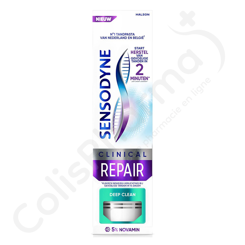 Begin met het verzorgen van gevoelige tanden in 2 minuten*! De 5% novamine formule van Sensodyne Clinical Repair Deep Clean vormt een beschermend laagje op de gevoelige delen van je tanden, en beschermt zo tegen gevoeligheid**. Sensodyne Clinical Repair Deep Clean is een dagelijkse fluoride tandpasta voor gevoelige tanden, met een rijke schuimende geltextuur en frisse muntsmaak. De tandpasta reinigt 32% effectiever*** en de verpakking is recyclebaar.