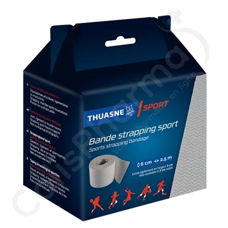 Thuasne Sport Strapping Bandage is een zelfklevende steunzwachtel die wordt gebruikt bij trauma of letsel aan gewrichten, banden of spieren, bijvoorbeeld na een verstuiking, ontwrichting, peesontsteking, verrekking of spierverrekking. De kleefband wordt op het gewricht of de spier (enkel, knie, dij, elleboog, enz.) geplaatst en de kleefkracht wordt versterkt dankzij een visgraatband en multidirectionele coating.