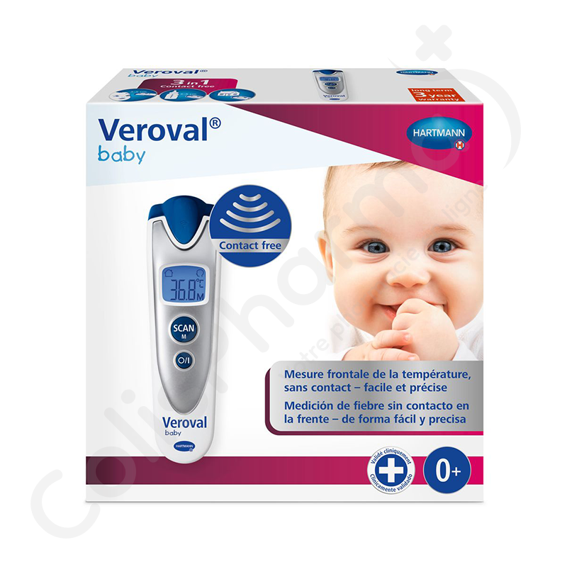 De Veroval Baby “3 in 1” thermometer meet de lichaamstemperatuur ter hoogte van het voorhoofd, de oppervlaktetemperatuur van een voorwerp en ook de omgevingstemperatuur van een kamer. Al deze metingen zijn contactvrij.