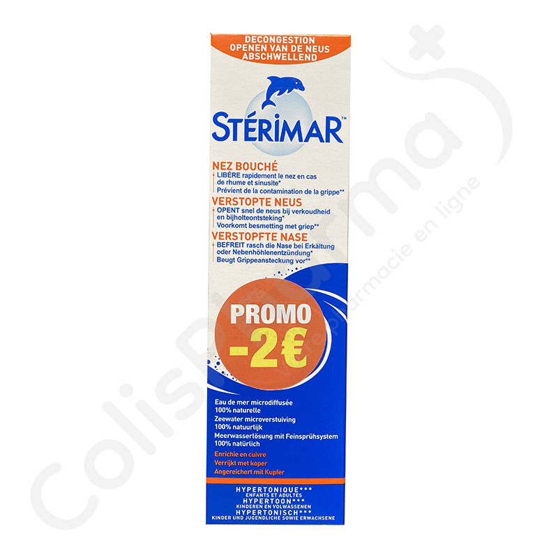 Stérimar Hypertonische Neusspray is een neusspray die wordt aanbevolen bij een verstopte neus. Het vergemakkelijkt de behandeling van verkoudheid en allergie.