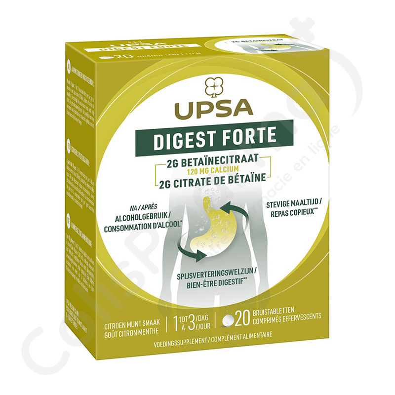 Upsa Digest Forte 20pc met betaïnecitraat en calciumcitraat draagt bij tot de normale werking van spijsverteringsenzymen.