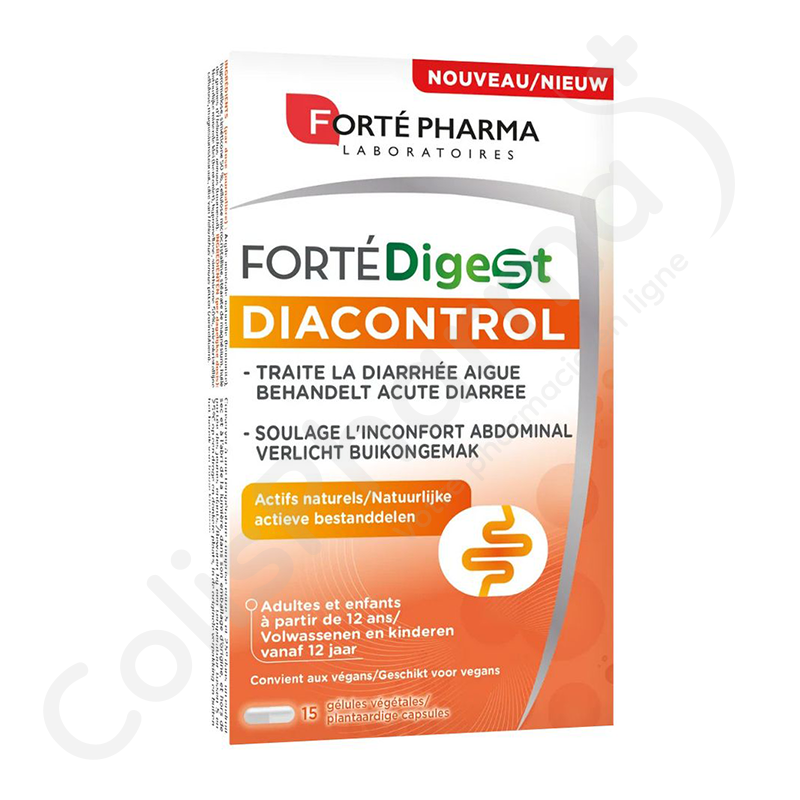 FortéDigest Diacontrol capsules verminderen de ernst en duur van diarree-aanvallen en verlichten buikkrampen en een opgeblazen gevoel in verband met acute diarree en darmklachten (gasvorming, een opgeblazen gevoel, een opgezette buik, buikpijn, ongemak en winderigheid).