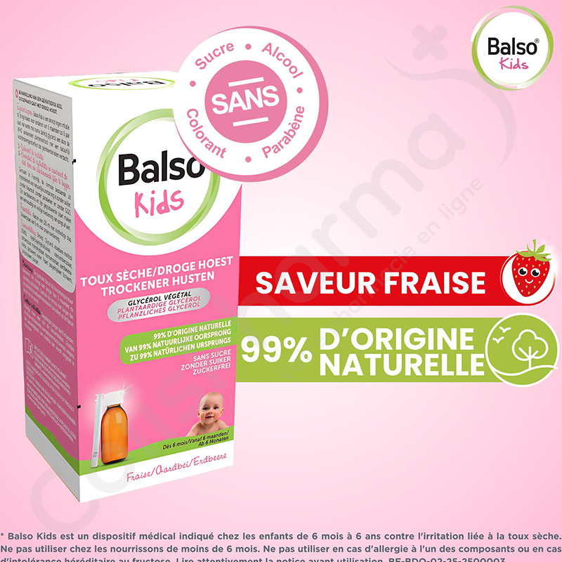 Balso Kids is een siroop voor kinderen van 6 maanden tot 6 jaar tegen irritatie veroorzaakt door een droge hoest ten gevolge van virale infecties van de luchtwegen die neus-keelontstekingen en verkoudheden veroorzaken, en door bepaalde externe factoren zoals sigarettenrook, luchtvervuiling en stof...