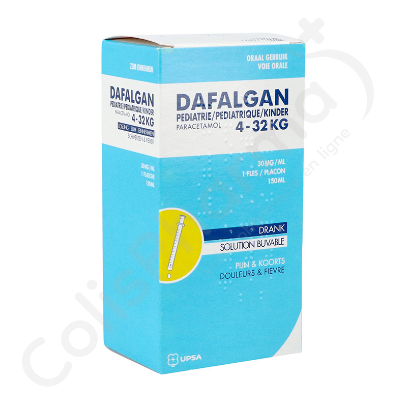 Dafalgan Pediatric 30 mg/ml, verkrijgbaar in België, is een pijnstiller en koortsverlagend middel met paracetamol als werkzame stof. Het is daarom gelijkwaardig aan Doliprane, verkrijgbaar in Frankrijk, waarvan ook paracetamol als werkzame stof aanwezig is. Doliprane, de Franse merknaam voor paracetamol, is te vinden op ColisPharma onder de volgende naam: Dafalgan.